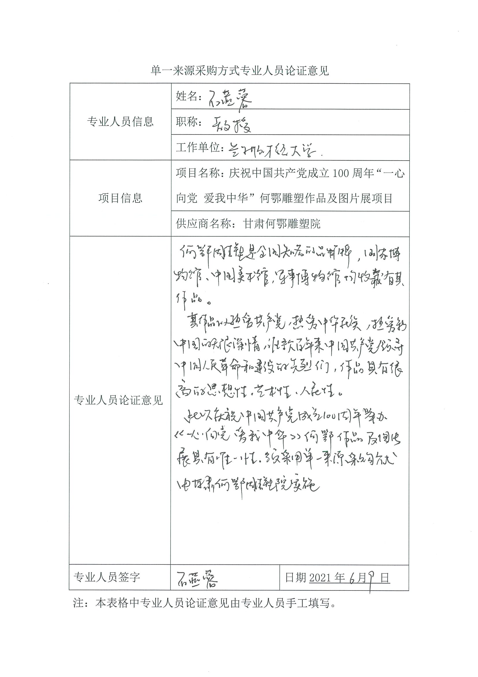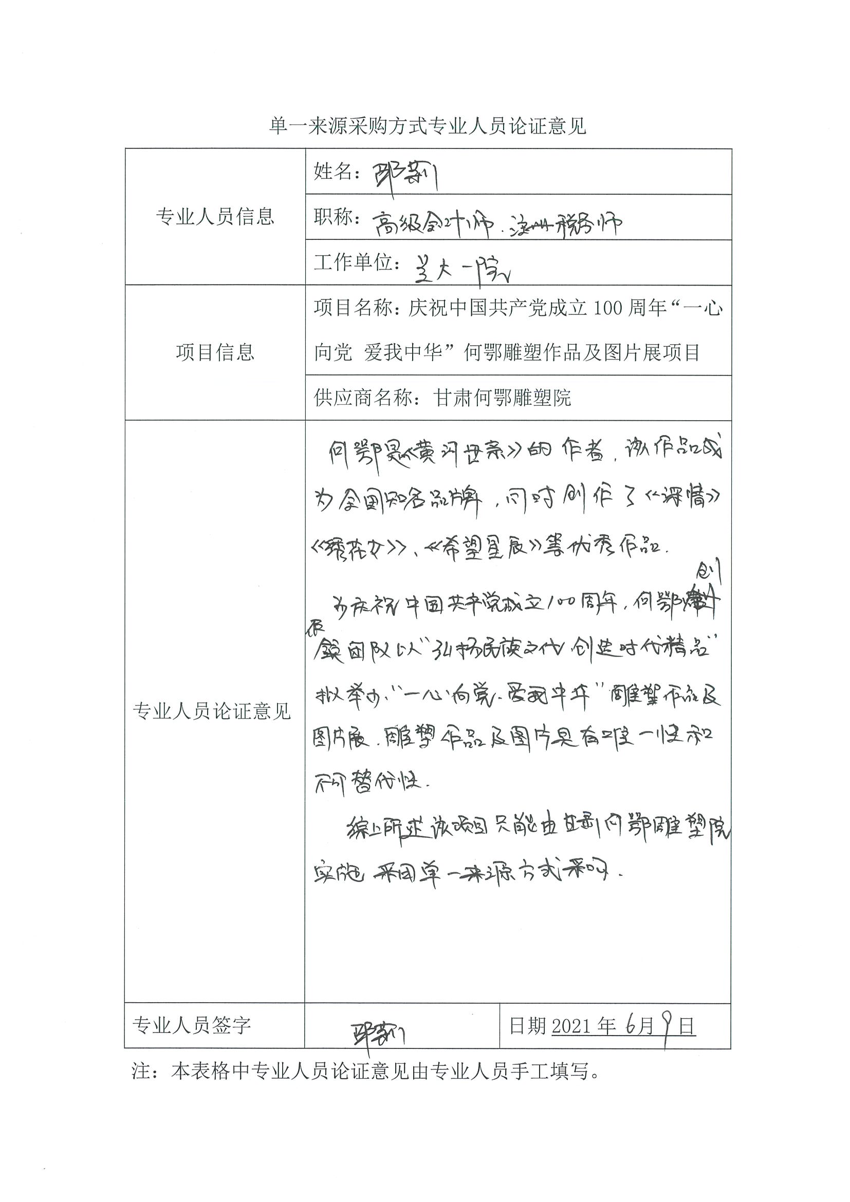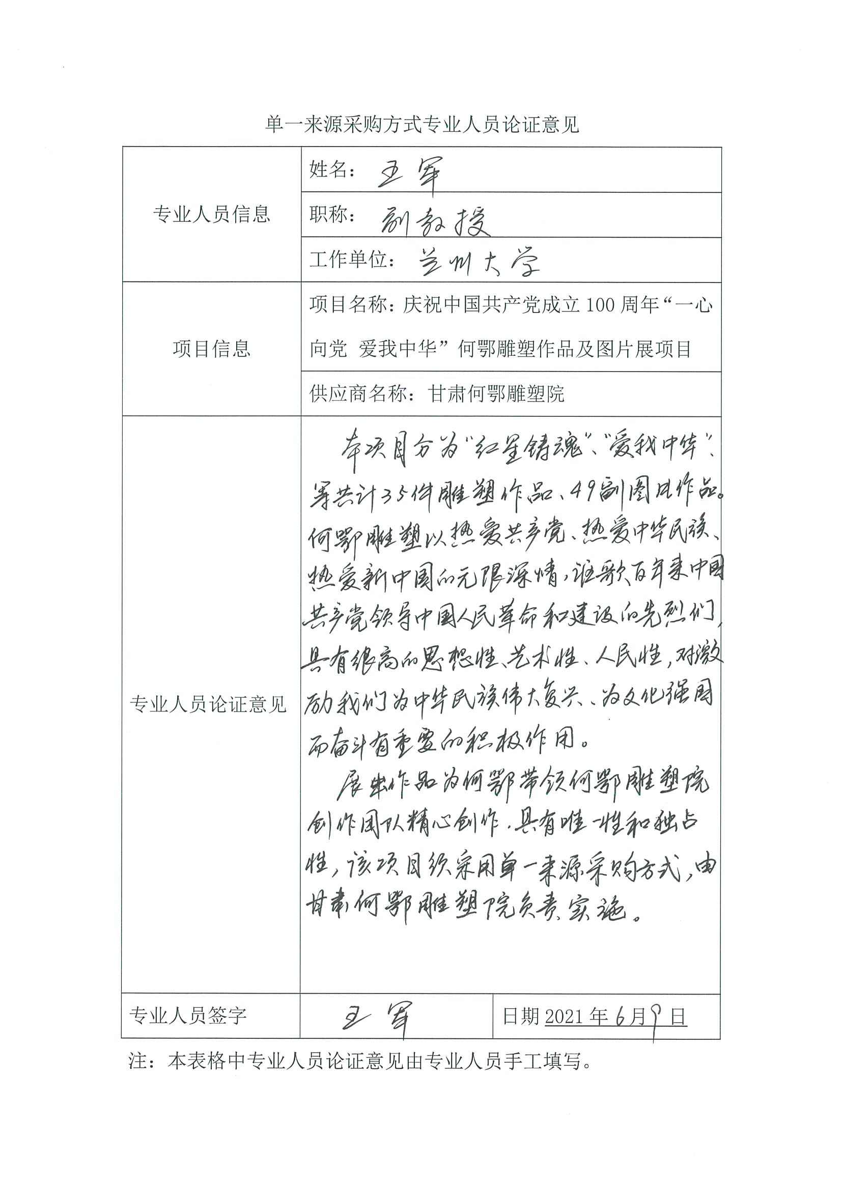 采用單一來源采購方式的原因及說明:何鄂雕塑是全國知名品牌,國家博物館、中國美術(shù)館、軍事博物館均收藏其作品。何鄂雕塑以熱愛共產(chǎn)黨,熱愛中華民族,熱愛新中國的無限深情,謳歌百年來中國共產(chǎn)黨領(lǐng)導(dǎo)中國人民革命和建設(shè)的先烈們。展出的作品具有很高的思想性、藝術(shù)性、人民性。此次“慶祝中國共產(chǎn)黨成立100周年“一心向黨 愛我中華”何鄂雕塑作品及圖片展項(xiàng)目”何鄂雕塑作品及圖片展具有唯一性和獨(dú)特性,須采用單一來源采購方式,由甘肅何鄂雕塑院實(shí)施。