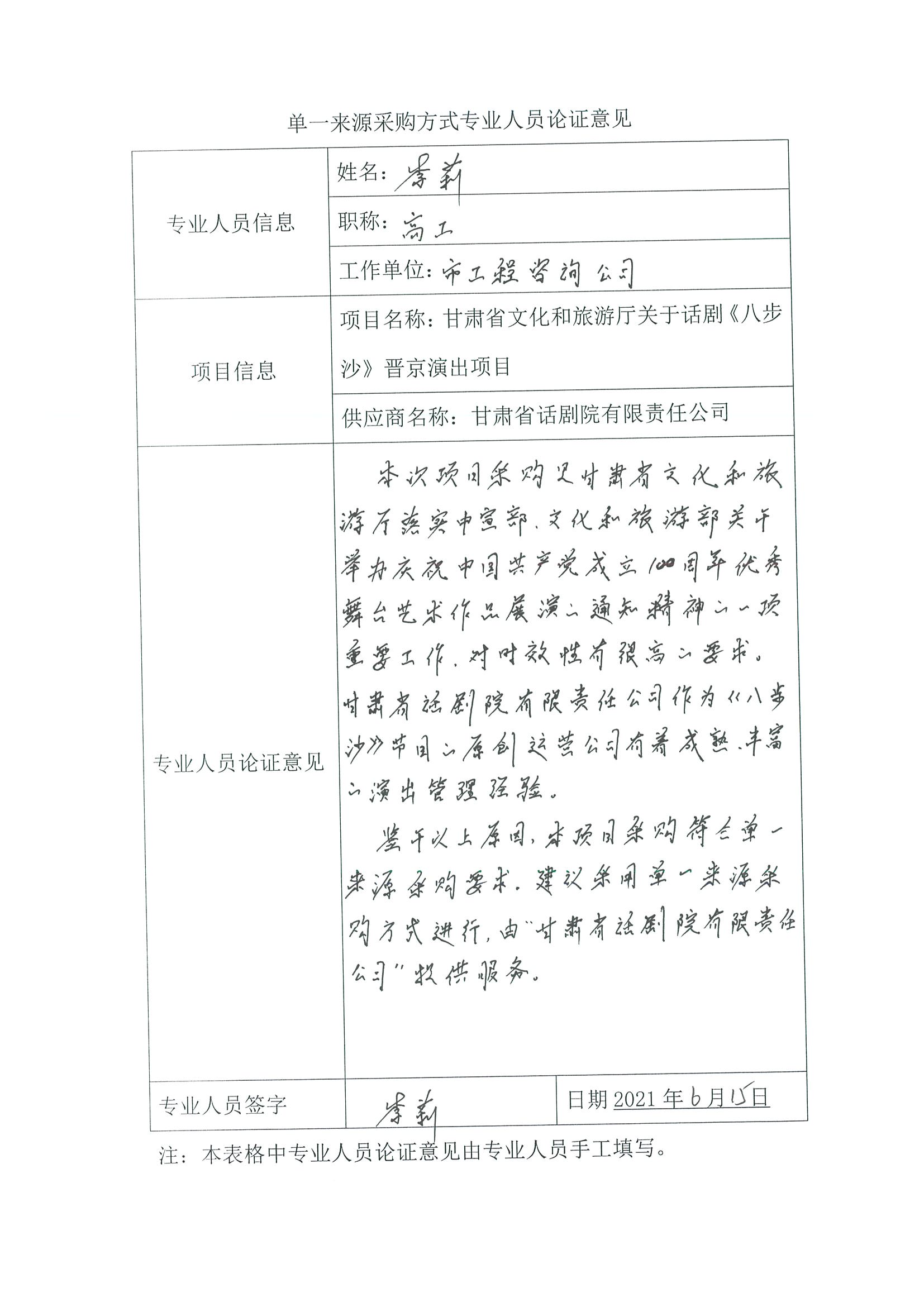采用單一來源采購方式的原因及說明:甘肅省文化和旅游廳慶祝中國共產黨成立100周年優(yōu)秀舞臺藝術作品展演活動,其中《八步沙》是甘肅省話劇院有限責任公司獨立創(chuàng)作優(yōu)秀話劇作品,內容是全面貫徹黨中央精神,圍繞興文化、展形象的使命任務。展現甘肅“建黨百年 春綠隴原”真實再現時代楷模“一古浪縣人八步沙六老漢三代人”先進群體治沙造林感人事跡的大型原創(chuàng)話劇進京巡演,只能用單一來源方式采購,由甘肅省話劇院有限責任公司承演。